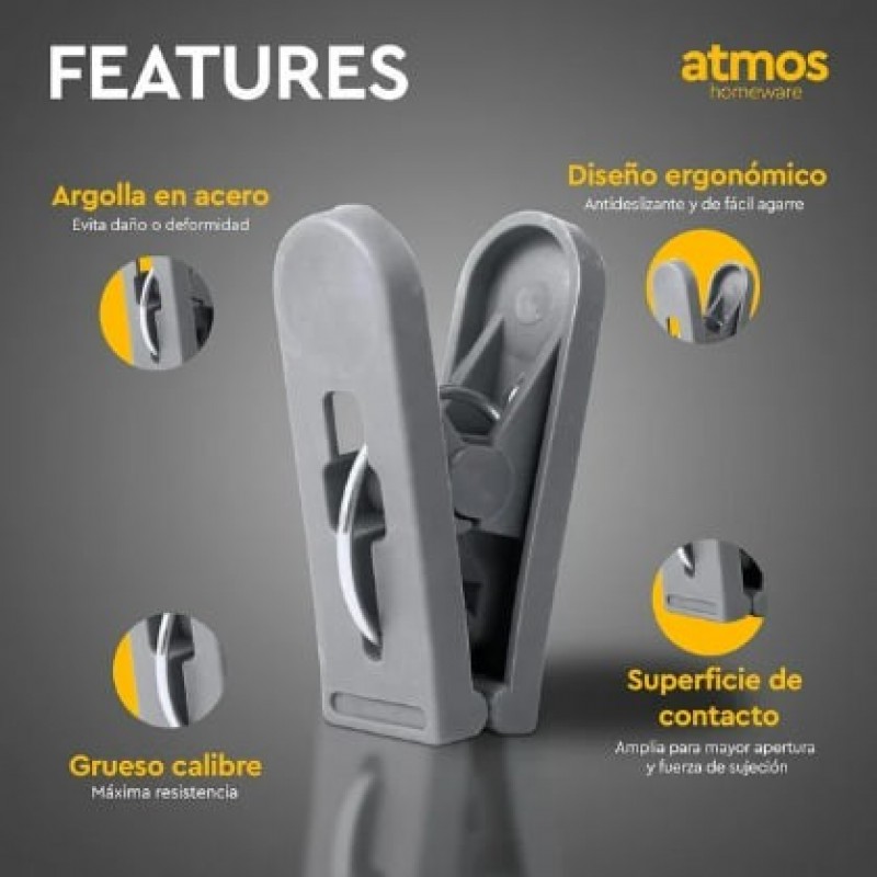 Наши многофункциональные зажимы изготовлены с использованием передовой технологии. Они имеют широкую контактную поверхность и кольцевой механизм из оцинкованной стали, что обеспечивает более надежное открывание и прочность захвата без повреждений или деформации, гарантируя более длительный срок службы и делая их самыми прочными на рынке. Благодаря эргономичному, нескользящему и удобному дизайну вы можете максимально эффективно использовать каждый зажим в любой повседневной ситуации. Эти многофункциональные зажимы идеально подходят для дома; вы можете повесить на них все, от одежды до простыней, покрывал и одеял. Вы также можете использовать их на кухне для запечатывания продуктов и пакетов с кофе, а также они идеально подходят для школьных проектов ваших детей, рукоделия и вязания. Мы стремимся предлагать высококачественный, экологически чистый продукт, поэтому наши зажимы изготовлены из 100% переработанного пластика. Универсальные зажимы; размеры каждого зажима: 5,5 см в длину x 3,5 см в высоту x 1,5 см в ширину. Набор из 36 предметов, 100% мексиканский продукт.