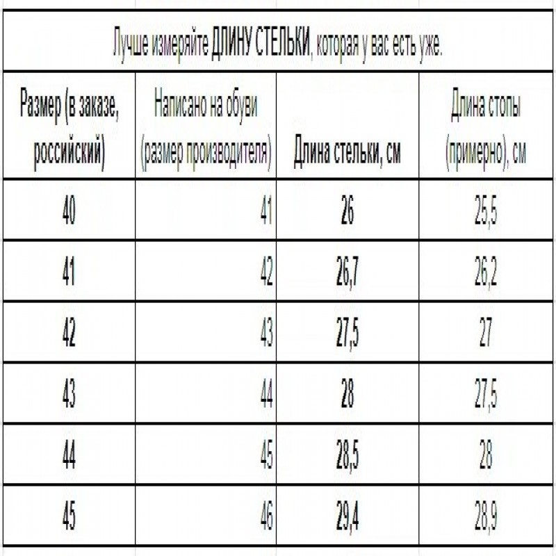 Внимание! При заказе товара вы выбираете ваш российский размер исходя из длины вашей стопы. Например, если длина вашей стопы 28 см, то необходимо выбрать размер 44 RU. Размер, указанный на товаре к российскому размеру не имеет отношения. Он может быть больше или меньше на 1, 2, 3, чем российский размер.
