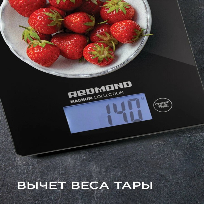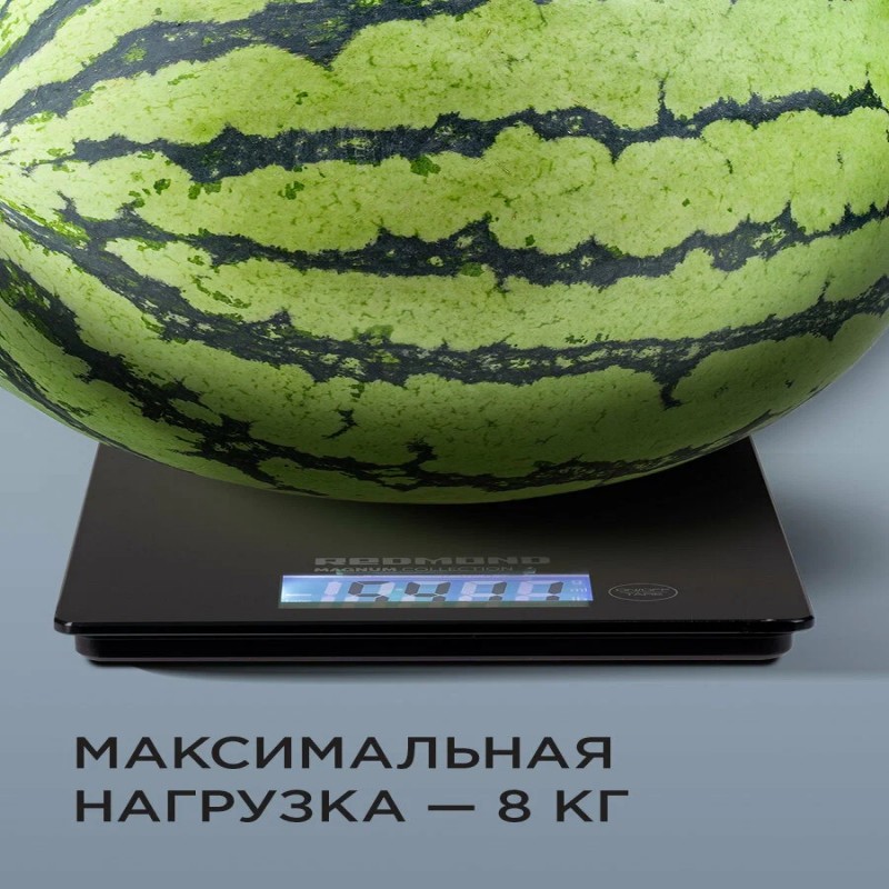Модель предназначена для взвешивания продуктов весом до 8 кг — можно положить на платформу даже арбуз.