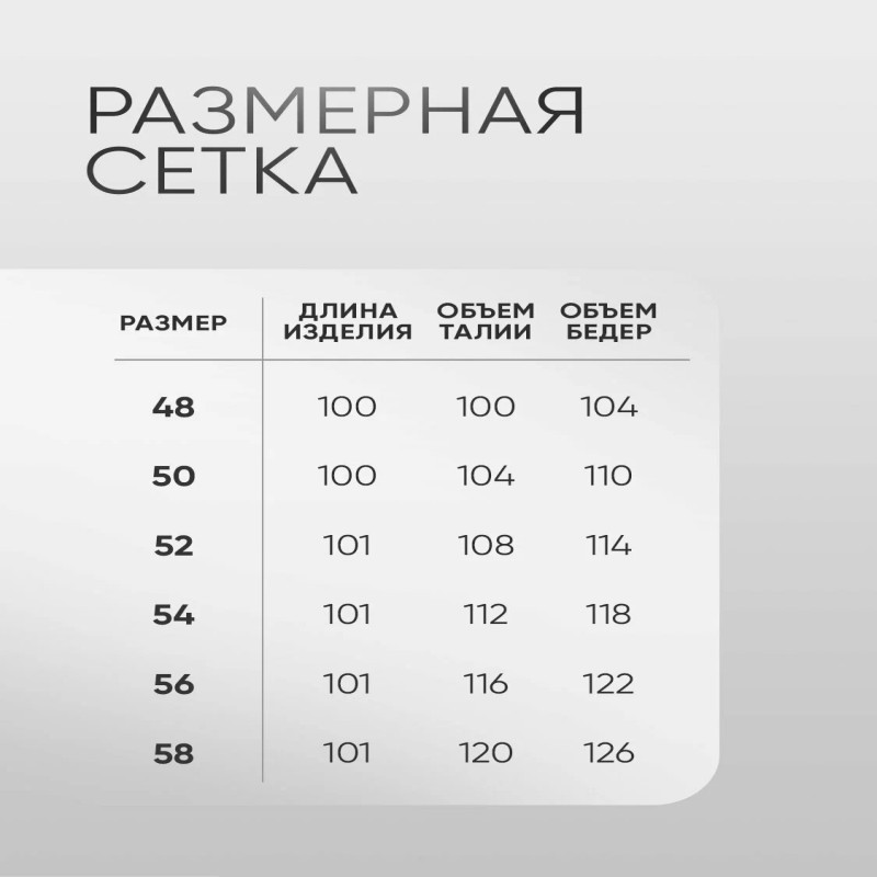 Брюки представлены в размерах 48, M, XL и L, что позволяет выбрать подходящий вариант для обхвата бедер от 104 до 108 см и обхвата талии от 78 до 82 см.