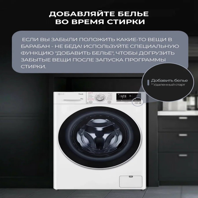 Обладая функцией Steam, машина заботится о вашем комфорте и здоровье, предлагая специально разработанные циклы с паром, которые подходят даже для вещей новорожденных. Также добавлена функция Добавить белье, позволяющая легко дополнять цикл стирки забытыми вещами после его старта.