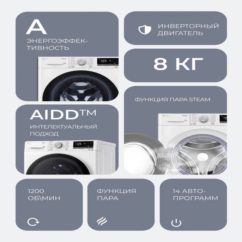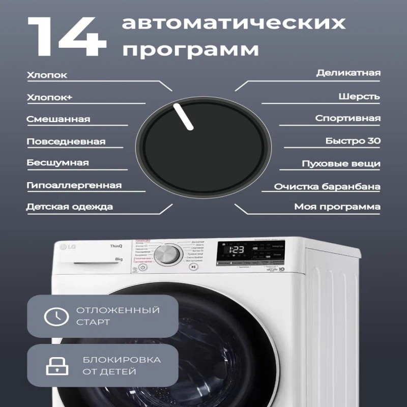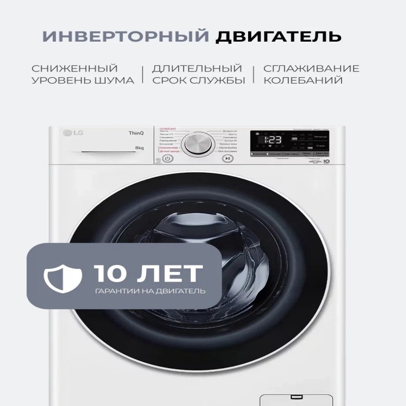Инновации в вашей бытовой технике для дома: инверторный мотор с системой прямого привода, к которому крепится барабан, минимизирует износ, обеспечивая высокую надежность и долговечность, а отсутствие щеток и ремня в конструкции привода сводит уровень шума к минимуму. Дополнительно машина оснащена системой Smart Diagnosis, что позволяет самостоятельно диагностировать неисправности стиральных машин LG через приложение, определяя до 80 видов поломок и отображая данные на смартфоне, для экономии времени и денег.
